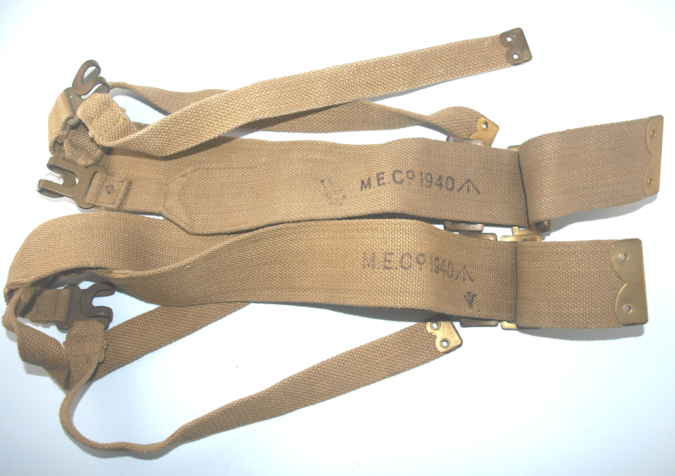 1940 Dated unissued matched pairs of MECo manufactured L straps for large and small packs, unissued condition, 1940 dated, genuine items. Brass will sometimes need polishing to clean up, will have tarnishing from age and possible verdigris. fine Wire wool, polish and some elbow grease will clean it up. Photo Shows typical stock examples.