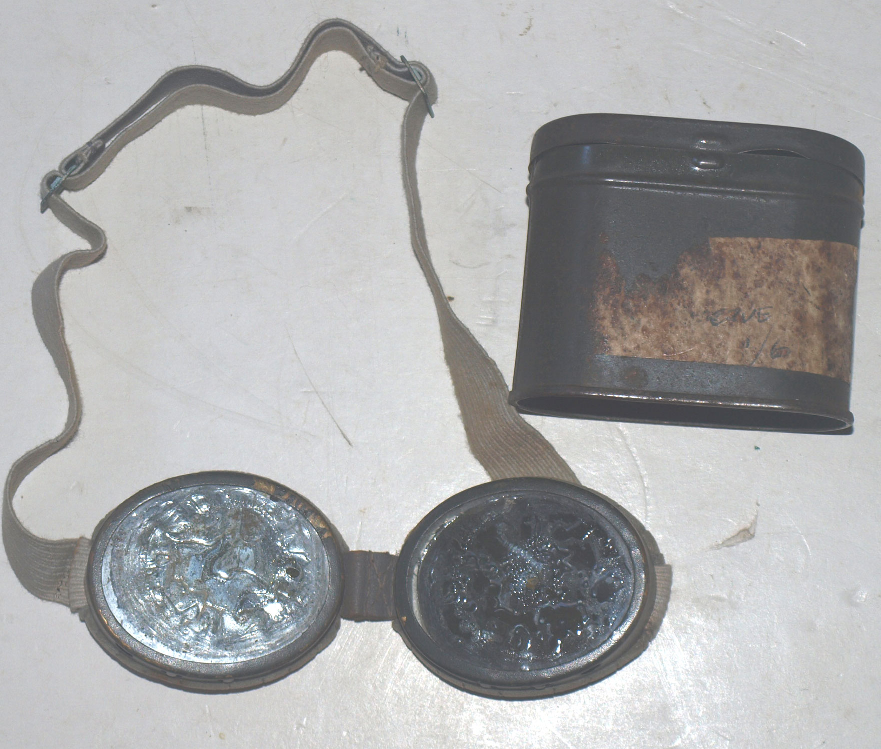 Green drivers goggles with tinted lenses which have sadly delaminated. Complete with tin. Priced to clear.