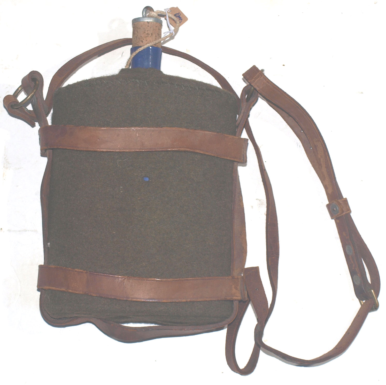 Homeguard/ATS Waterbottle Carrier and early war blue enamel waterbottle, carrier dated 1941 on strap, bottle has a couple of moth nips