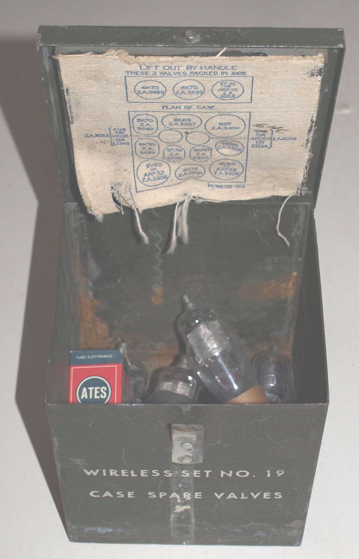 Metal box for spare valves for the WS19. No insert. Contents drawing on lid. Comes with 5 valves, not known if related to WS19 or whether working, catch need adjusting.